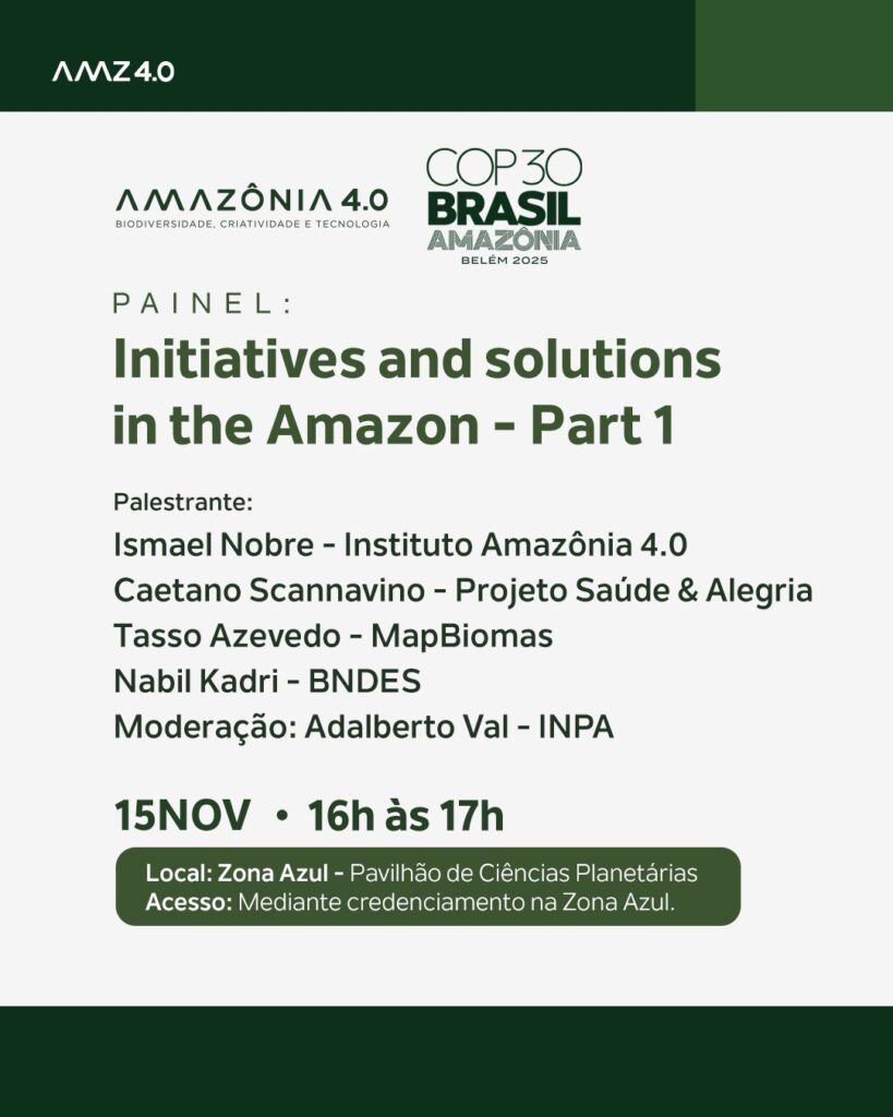 O Instituto Amazônia 4.0 chega à COP30, em Belém, com uma programação dedicada à bioeconomia, à inovação e à construção de um futuro sustentável para a Amazônia.Nossa participação reúne painéis e diálogos sobre soluções baseadas na natureza, ciência, tecnologia e políticas públicas, impulsionando o desenvolvimento sustentável da região amazônica.Ao lado de parceiros de diferentes setores, apresentaremos iniciativas que integram conservação, economia e conhecimento local para fortalecer a agenda climática global.