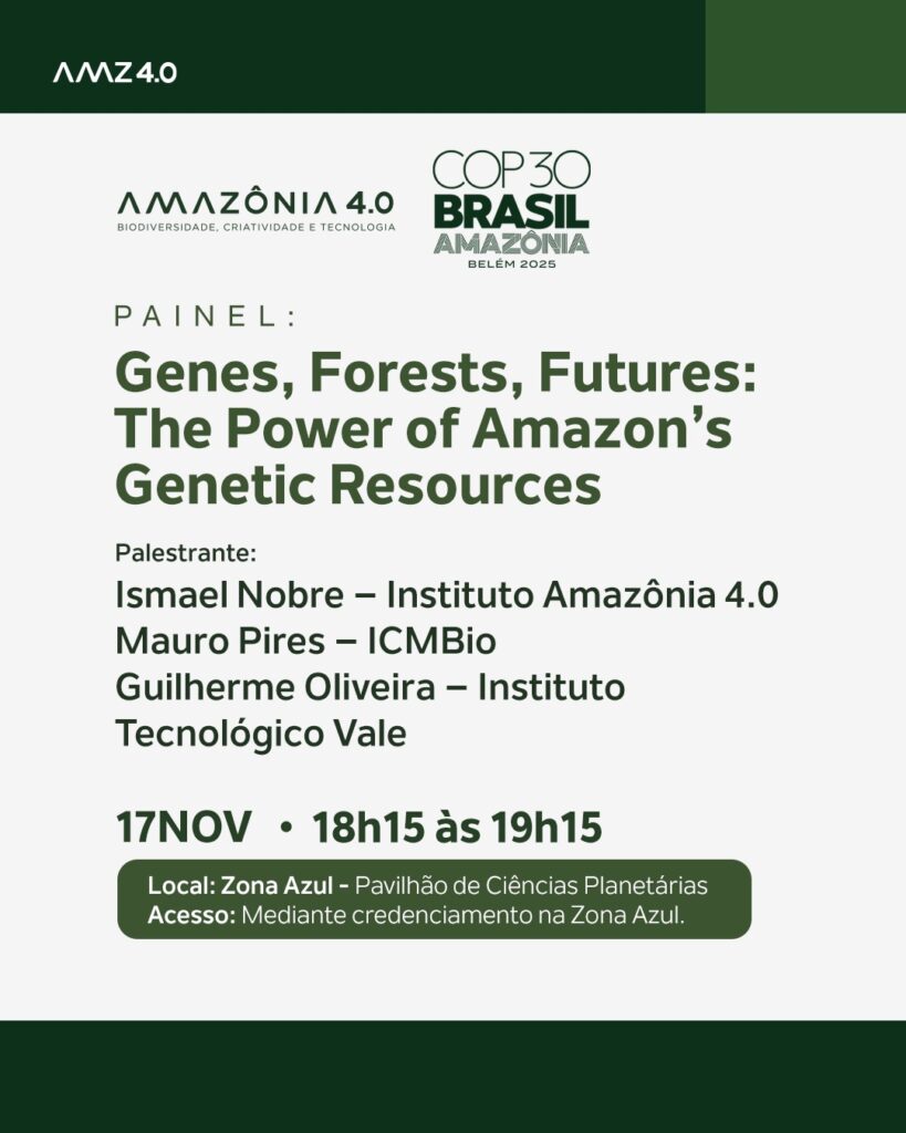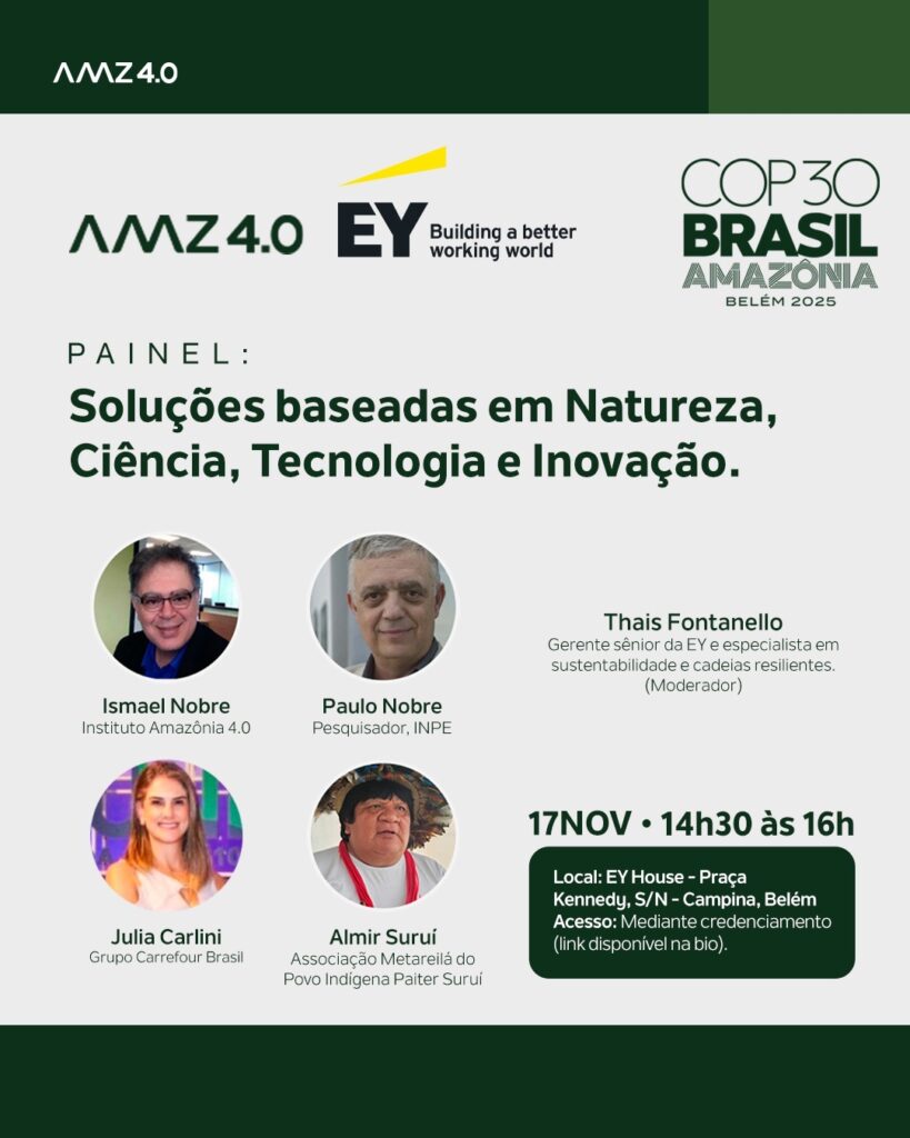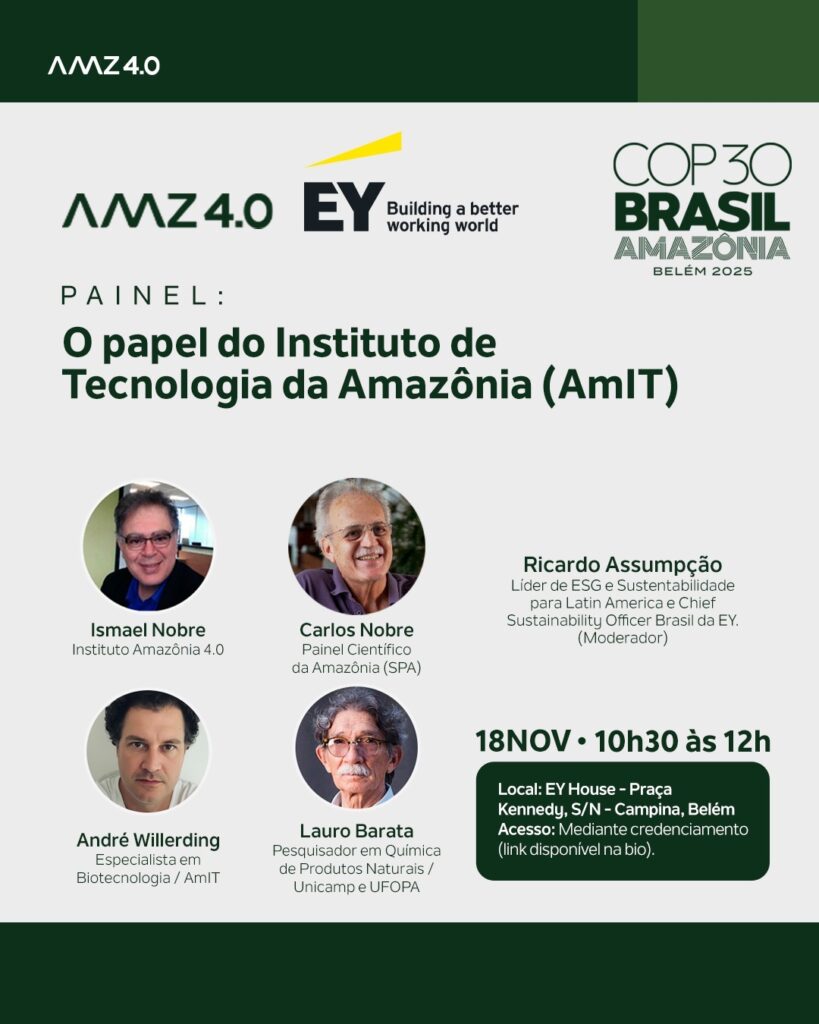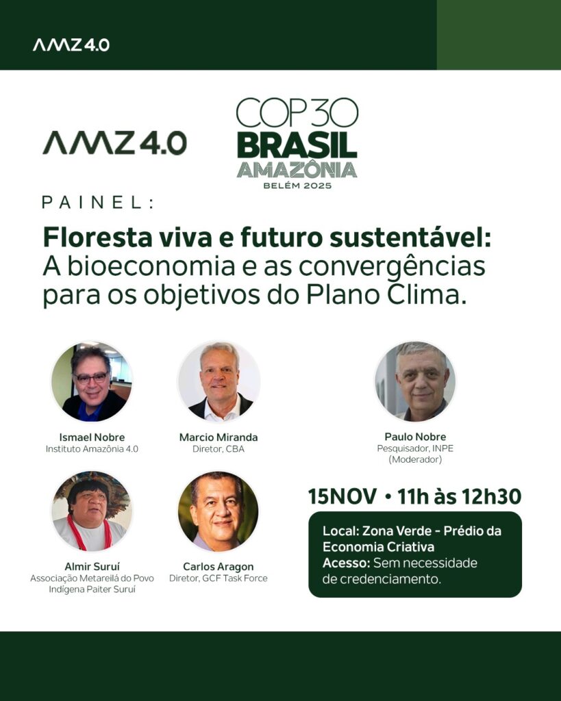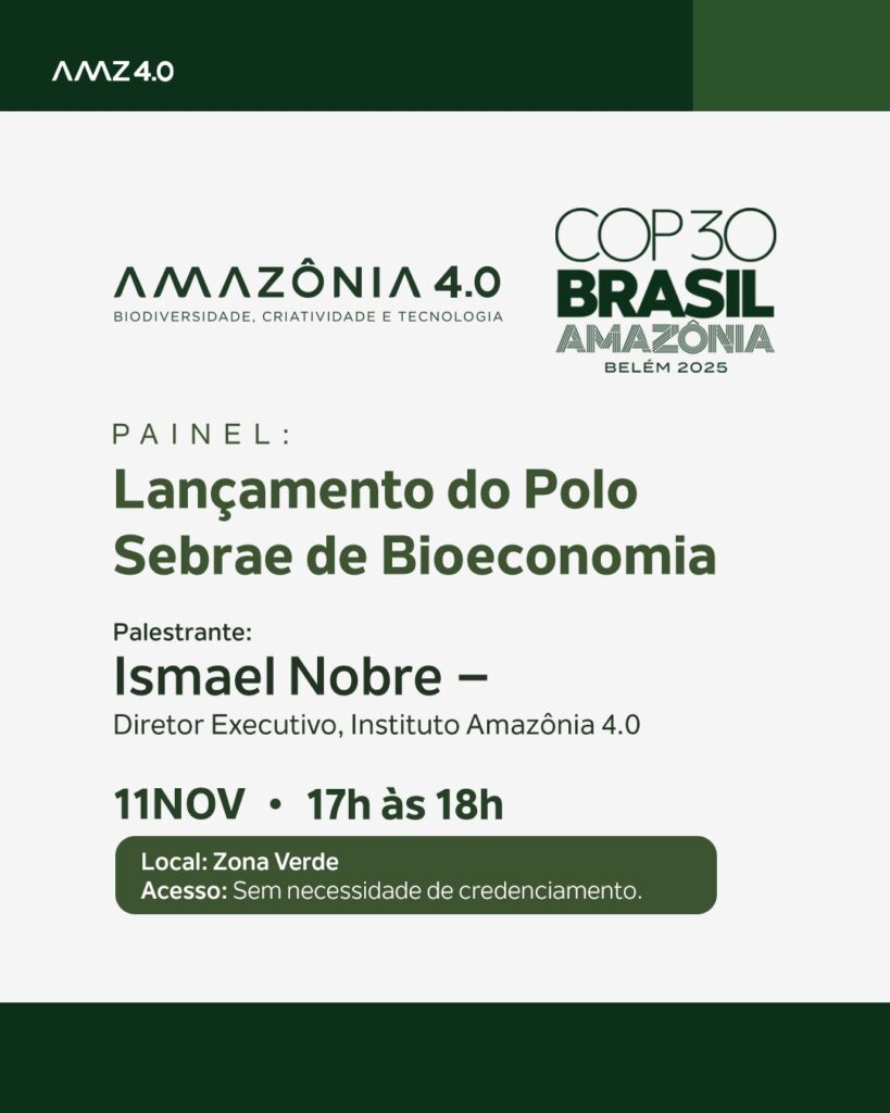 O Instituto Amazônia 4.0 chega à COP30, em Belém, com uma programação dedicada à bioeconomia, à inovação e à construção de um futuro sustentável para a Amazônia.Nossa participação reúne painéis e diálogos sobre soluções baseadas na natureza, ciência, tecnologia e políticas públicas, impulsionando o desenvolvimento sustentável da região amazônica.Ao lado de parceiros de diferentes setores, apresentaremos iniciativas que integram conservação, economia e conhecimento local para fortalecer a agenda climática global.